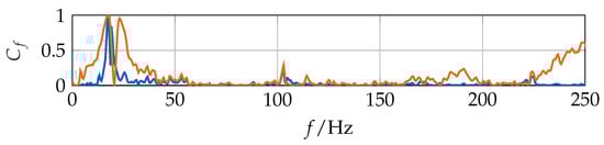 It must be possible to add an additional excitation current after the controller current to be able to excite the system. The excitation signal can be very simple, e.g., using white noise. The force applied by the AMBs can be obtained by recording the current commanded by the controllers ( and ). If the constant , see Equation (4), of the AMBs is known, the forces can be evaluated. Note, however, that FRFs can also be scaled by the currents. The FRFs, then, have different meanings but can still be used similarly to what is done in this contribution for monitoring purposes. For the FRFs of the system, the response of the rotor must be measured. If the AMB’s stiffness and damping should be estimated using the decoupling procedure in Section 5, the response signals must be captured in positions very close to the AMBs. Classical AMBs have integrated displacement sensors close to where the force is applied because this signal is necessary for the AMB-controller anyway. The results of a measurement must be recorded, either in the time domain or directly in the frequency domain. Using these results, the FRFs can be computed using a standard FRF-estimation algorithm.