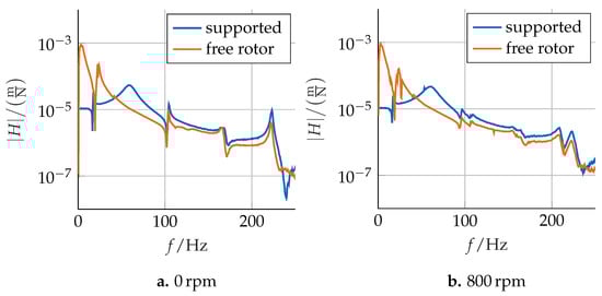 Figure 11 gives a summary of the experimentally determined FRFs. Each sub-figure shows the results from one measurement run, for and , respectively. This clearly shows the difference between the supported system’s and free rotor’s FRFs, where the rigid body modes are apparent at small frequencies for the free system and the distinct peak at around 58 Hz only appears in the supported system. By comparing the left and right parts of Figure 11, the splitting of eigenfrequencies with rotation becomes clear.