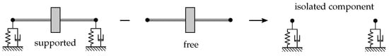 Dynamic substructuring allows us to combine or decouple substructures, cf. [,]. Frequency-based substructuring uses frequency response functions of dynamic systems. The so-called dynamic decoupling uses dynamic stiffnesses, which are the inverse of frequency response functions . Figure 12 shows the decoupling procedure to obtain the bearing dynamics. The free rotor is decoupled from the supported system, which yields the bearing dynamics, without the influence of the rotor itself. In primal decoupling, this is written as: