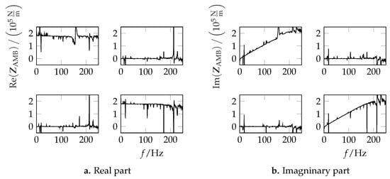 The dynamic stiffness matrix of the isolated AMB is the the result of the decoupling procedure, see Equation (8). The results of the decoupling are shown in Figure 13. The degrees of freedom are the x-directions in magnetic bearings 1 and 2. They are given as real and imaginary parts in sub-figures a and b, respectively.