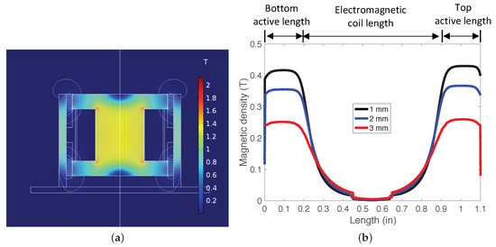 In order to analytically evaluate the electromagnetic characteristics of the MRE-DVA, a finite element method (FEM) was used in this study. Figure 3 presents one example of the analytical electromagnetic characteristics of the MRE-DVA at an applied current input of 0.7 A. In this design, the outer diameter and height of the DVA were 1.64 inches and 1.25 inches, respectively. The top and bottom active lengths were 0.2 inches that were selected to achieve the desired stiffness of the MRE-DVA and the electromagnetic coil height was 0.7 inches. Two MRE pads were placed at the top and bottom active lengths and each MRE pad height was 0.45 inches. The coil turn number of the electromagnetic coil was 625 and the coil wire was 28 AWG (American wire gauge). The maximum applied current input was 0.7 A that was selected by the maximum allowable current not to burn out the electromagnetic coil wire. The magnetic behavior of the bobbin and the outer cylinder was emulated by the nonlinear saturation curve of a low-carbon steel. The magnetic behavior of the MRE pad was assumed to be linear and its relative magnetic permeability was chosen to be three, which was the measured magnetic property for an isotropic MRE with the volume fractions (percentage by volume, vol%) of 30–40% carbonyl Fe particles reported in the reference [47]. As seen in Figure 3a, the magnetic flux generated from the electromagnetic coil was well circulated through a closed path in the confined area. The magnetic flux leakage to the air space surrounding this MRE-DVA was insignificant because there was a significantly large magnetic permeability difference between the low-carbon steel (e.g., ) and the air (e.g., ). Thus, the magnetic flux density was well concentrated at the active length areas and its magnetic flux density level was almost uniformed. Three different MRE pad gaps such as 1 mm, 2 mm, and 3 mm were considered in this study. As seen in Figure 3b, the 1 mm gap case presented the highest magnetic flux density over the active length areas. In addition, the magnetic flux density decrement from the 2 mm to the 3 mm gap case was larger than the decrement from the 1 mm to the 2 mm gap case, because the magnetic flux density is inversely proportional to the gap squared. As a result, the lowest magnetic flux density level over the active length areas was obtained in the 3 mm gap case.