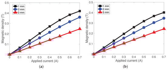Figure 4 presents the analytical magnetic flux densities on the active lengths of the MRE-DVA with respect to the applied current inputs. For the 2 mm and 3 mm gap cases, the magnetic flux density increased almost linearly in response to the applied current input. However, for the 1 mm gap case, the magnetic flux density started to be saturated for applied current inputs above 0.6 A. On the other hand, the magnetic flux density levels for the top and bottom active lengths, as well as their field-dependent behaviors, were very similar.