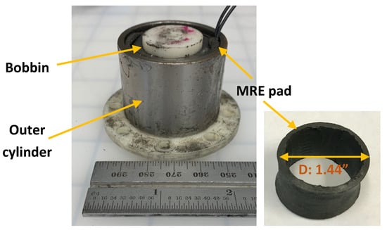 Figure 5 presents a photograph of the fabricated MRE-DVA. The bobbin and the outer cylinder were made of a low-carbon 12L14 steel and the bottom frame was made of 3D printed plastic material (ABS-P430, Stratasys). In this study, MRE pads with three different thicknesses (i.e., 1 mm, 2 mm, and 3 mm) were fabricated and their effects on the vibration isolation performance of the MRE-DVA were experimentally investigated. To this end, three different MRE-DVAs with different MRE pad thicknesses were fabricated and tested.