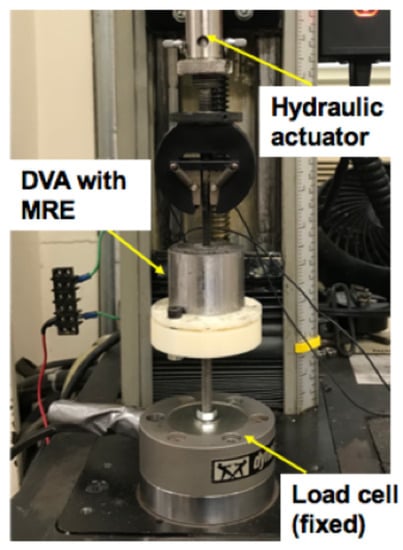 In order to evaluate the damper force behavior of the MRE-DVA, an Instron material testing system (model: DynaMight 8841) shown in Figure 6 was used. The bottom of the DVA was connected to the fixed load cell and the magnetic core (i.e., bobbin) was attached to the hydraulic actuator. When a sinusoidal excitation displacement was applied to the magnetic core, the damper force of the MRE-DVA was measured by the load cell with respect to different current inputs. The excitation displacement was measured by a linear variable differential transformer (LVDT) built into the hydraulic actuator. The commanded amplitude of the excitation displacement was mm and the excitation frequencies were 0.1 Hz and 150 Hz. The sampling frequency for the data acquisition in this study was 5 kHz.