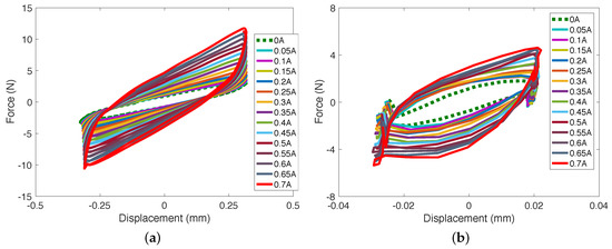 Measured damper force of the MRE-DVA versus the displacement (for a 3 mm pad thickness): (a) at 0.1 Hz and (b) at 150 Hz.