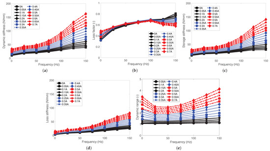 Complex stiffness analysis of the MRE-DVA in the frequency domain (3 mm pad thickness): (a) dynamic stiffness, , (b) loss factor, , (c) storage stiffness, , (d) loss stiffness, and (e) dynamic range, .