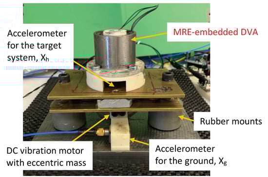 Figure 9 presents the testing setup for measuring the frequency response of the target system with the MRE-DVA. The mass of the target system was 1027 g and the rubber mounts worked as a supporter of the target mass and also the stiffness and damping components of the target system. To excite the target mass, the eccentric vibrating motor with an eccentric mass of 4 g was configured at the bottom base. The rpm of the eccentric vibrating motor was swept by using the DC motor controller to excite the target mass up to 250 Hz. To measure the vibrations of the target mass and the bottom base, the accelerometers were placed atop the target mass and also the bottom base. The measured accelerations of the target mass and the bottom base were stored at the computer through the data acquisition device. In Figure 9, the displacement of the bottom base was denoted by , and the displacement of the target mass was denoted by . In this study, the excitation amplitude of was about at 150 Hz. Here G is the gravitational acceleration. This corresponds to the displacement amplitude of about ±8.3 m at 150 Hz.