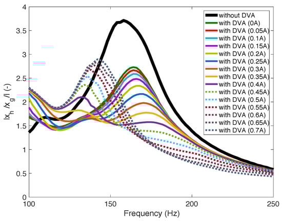 Figure 13 presents the effect of the MRE pad thickness on the vibration isolation performances of the MRE-DVAs. In this case, three different MRE pad thicknesses such as 1 mm (seen in Figure 13a), 2 mm (seen in Figure 13b), and 3 mm (seen in Figure 10) were tested. As seen in these figures, the case of 1 mm thickness did not particularly show the vibration isolation improvement over the baseline system with no DVA because the passive (i.e., zero current input) stiffness of the DVA at 1 mm MRE pad thickness became too large (please refer to Appendix A) As a result, the moving mass of the DVA worked like an almost lumped mass attached to the target mass and could not much improve the vibration isolation performance of the baseline system with no DVA. On the other hand, as seen in these figures, the resonant frequency of the MRE-DVA with 1 mm MRE pad thickness shifted only to the right side in the frequency domain, as the applied current input increased. However, for the cases of 2 mm and 3 mm MRE pad thicknesses, the resonant frequency of the MRE-DVA initially shifted to the right side at current inputs lower than 0.4 A. However, at a current input of 0.4 A, the resonant frequency jumped to the left side (i.e., from about 170 Hz to about 135 Hz). For further current inputs, the resonant frequency shifted again to the right side.