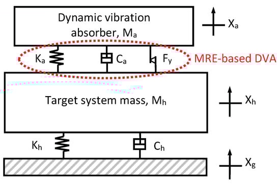 Since structures and systems are inevitably exposed to undesirable vibrations, vibration isolation technology has been an important research topic for several decades to protect them. One effective way of achieving vibration isolation is to use dynamic vibration absorbers (DVAs) because of their simplicity and low cost [1,2]. Typically, DVAs consist of a stiffness, a damping, and an oscillating mass, but can effectively reduce the forced vibration of host structures and systems excited by external harmonic excitations with a specific frequency [3,4,5]. However, passive DVAs typically have a narrow working frequency bandwidth only focused at their resonant frequency. Thus, they lack adaptability to changes in the excitation harmonic frequency [6,7]. As a result, even a slight mistuning of passive DVAs can result in poor vibration isolation performance. To broaden the working frequency bandwidth, adaptive DVAs that can adjust their resonant frequency via external control inputs have been recently developed in order to cope with shifting harmonic excitation. Several studies using electromagnets [8,9], piezoelectric materials [10,11], shape memory allosy [12,13], and magnetorheological elastomer (MRE) [14,15,16,17,18,19,20,21,22,23,24,25,26,27,28,29,30,31,32,33] have been reported to implement adaptive DVAs.