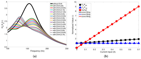 As seen in Figure 8e, the dynamic range over the tested frequency range was at relatively higher current inputs (above 0.5 A). This implies that the dynamic stiffness at the current input above 0.5 A was at least two times as large as that at no current input. In addition, this dynamic range is related to the resonant frequency adaptability of the MRE-DVA. Using this dynamic range value, , the resonant frequency, of the MRE-DVA at the current input of above 0.5 A was estimated to be shifted from to . Here, is the resonant frequency of the MRE-DVA at no current input.