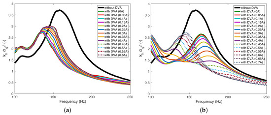 Effect of the MRE pad thicknesses on the vibration isolation performances of the MRE-DVAs: (a) 1 mm thickness and (b) 2 mm thickness.