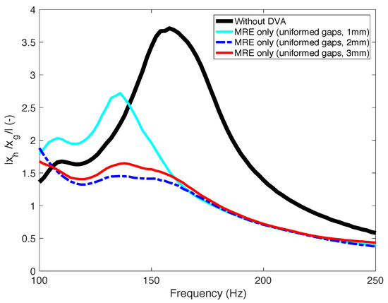 - From the vibration isolation testing, it was observed that the resonant frequencies of the MRE-DVAs could be substantially adjusted using an applied current input. For the 2 mm and 3 mm MRE pad thickness cases, the adjustable resonant frequency range by the current input was about 135–170 Hz. However, for the 1 mm MRE pad thickness case, the resonant frequency change was small because it was initially too stiff for no current input (0 A).