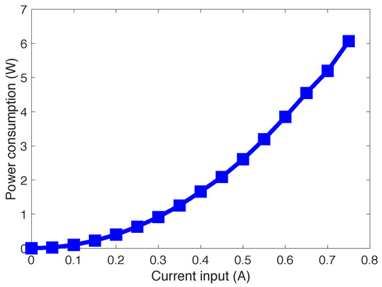 Figure 15 presents the power consumption of the MRE-DVA. The maximum power consumption of the MRE-DVA used in this study was as small as nominally 6.1 W at a current input of 0.7 A.