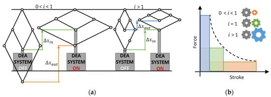 (a) Schematic concept illustration of a generic DEA system coupled to stroke magnifying and stroke reducing scissor linkages with input strokes and output strokes , as well as (b) corresponding generic force-stroke characteristics for different transmission ratios.