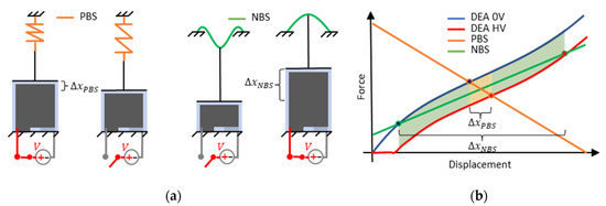 Diaphragm DEAs are not capable of generating compressive forces and must therefore be preloaded with a biasing force. This force can be realized by using different biasing elements such as antagonistic working DEAs [26], masses [22], magnets [31], air pressure [32], or different kinds of spring elements and mechanisms. The choice of the preload characteristics has a decisive influence on the performance of the resulting DEA system, especially for static operation. This is proven in several works [22,23,24,30] and further explained in the following by the schematic illustration in Figure 3, which compares two DEA systems based on identical SIPs. The left-hand side in Figure 3a shows a SIP that is biased with a common tensile spring that behaves as PBS. The output stroke of this system is in the presence of a high voltage . The right-hand side of Figure 3a shows an identical SIP, which is biased with an inclined and centrally loaded buckled beam. The force-displacement characteristics of this buckled beam typically are strongly non-linear and have a negative stiffness over a wide range, thus behaving as an NBS. The output stroke of this system is when a high voltage is applied. Comparing the two systems one can see that the SIP-NBS system generates a significantly higher stroke. This can also be observed in Figure 3b, where the static design curves of the SIP are drawn in a force-displacement diagram. The SIP curves refer to two different scenarios, respectively with no voltage and a target high voltage applied. The system resulting stroke is identified by the intersections of the DEA curves with the force-displacement curves of the biasing mechanisms. Here, the behavior of the NBS is also assumed to be linear in the considered range for simplicity. Since the biasing mechanisms work against the DEA, their slopes are reversed in the graph. In addition to the stroke, also the mechanical work of the SIP-NBS system (obtained by applying a target voltage on the unloaded DEA), which is indicated by the green and the yellow-colored area in the graph, is significantly higher compared to the SIP-PBS system (yellow area). Hence, the SIP-NBS system not only generates higher stroke but also higher convertible energy which can be further optimized by choosing an appropriate negative stiffness or even a nonlinear characteristic for the bias. Such a system is referred to below as a performance-optimized SIP system or, more generally, a performance-optimized DEA system. The above considerations only apply to the static operation since dynamic effects are not taken into account.