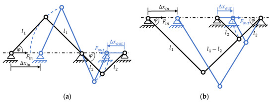 Kinematic chain of a scissor linkage with link lengths of and , rotation angle , input stroke , output stroke and corresponding forces and in (a) an inverting transmission configuration and in (b) a non-inverting configuration.