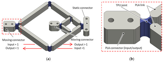 (a) CAD of one-piece scissor linkage mechanism with a non-inversing transmission configuration, where input and output sides can be swapped, and (b) detailed view of the design of a TPU joint and PLA connector and link.