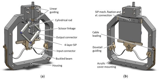 The components presented above are combined into housing to form a SIP actuator system. Figure 8 illustrates the CAD assembly of one version with stroke-reducing characteristics ( = 3:1) as an example, with Figure 8a showing the transmission mechanism side and Figure 8b showing the SIP side. The housing, which is of nearly square dimension, is also 3D-printed and consists of a rigid polyethylene terephthalate (PET) filament. On the lower side, it accommodates the inclined buckled beam NBS via female dove-tail guides and enables them to be fixed after a horizontal linear adjustment. The moving side of the SIP is mounted via the SIP-NBS flange, featured by the middle clamp of the NBS. The opposing static side of the SIP is fixed by screws to the upper edge of the housing and can be adjusted vertically beforehand with help of slotted holes. This enables to obtain a defined mechanical preload of the SIP-NBS system and an exact adjustment of the mechanical working point. For the stroke-reducing transmission, the static connector of the scissor linkage is also attached to the upper edge of the housing, and the outer moving connector, representing the input side, is attached to the SIP-NBS flange. The inner moving connector, representing the output side of the transmission, carries along a cylindrical rod which is led through a linear guiding outside of the housing. The movement of this rod can be used to drive an external load by applying a voltage to the electrical contacts, which are led out of the side of the housing. Both sides of the housing are covered with a transparent acrylic glass pane so that the housing is closed, and the user does not come into contact with electrical or mechanical system components for safety reasons. Thanks to this measure, the system is also protected from environmental factors such as moisture and dust. A frontal view of the transmission side of the actuator is shown in Figure 9. Besides this stroke-reducing system ( = 3:1), another system without a transmission mechanism ( = 1:1) and one with stroke-magnifying transmission ( = 1:3), is designed and manufactured.