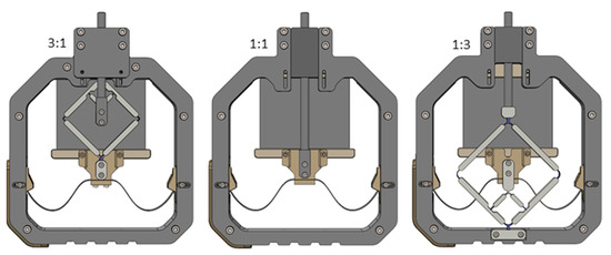 CAD comparison of the realized systems with the stroke-reducing transmission on the left, the system without transmission mechanism in the middle, and the stroke-magnifying transmission on the right.