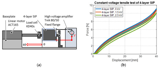 The first step in the static design process of the SIP actuator system is the characterization of the force-displacement behavior of the presented multi-layer SIP at different applied voltages. For this purpose, tensile tests are carried out on a test bench that is schematically illustrated in Figure 10a, and which is partially shown in the photo in Figure 5d. The static clamp of the SIP is mechanically fixed to an aluminum flange and electrically connected to a Trek Model 5/80 high-voltage amplifier, which provides voltages of up to 5 kV and currents up to 80 µA. The movable clamp of the SIP is connected to an Aerotech ACT165 linear motor, which provides strokes of up to 165 mm. In between linear motor and SIP, a load cell type KD40s by ME-Meßsysteme GmbH (Henningsdorf, Germany) is mounted, which provides a force measurement range of up to 10 N. Control and data acquisition are implemented in a real-time high-resolution National Instruments LabVIEW FPGA environment. The starting position of each experiment is chosen in such a way that the SIP exerts no tensile force on the load cell when no electrical voltage is applied. From this position, the motor executes a sinusoidal motion with a stroke of 40 mm and a frequency of 0.1 Hz, with a constant prescribed voltage.