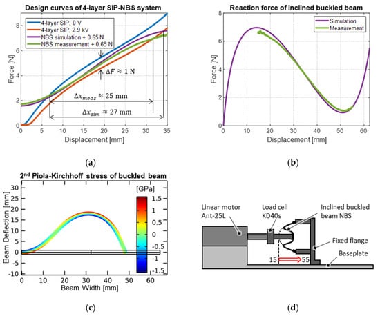 (a) SIP system design curves with the SIP working against inclined and centrally loaded buckled beam NBS and weight of moving components, with (b) comparison of FE-simulation to measurement results of the NBS reaction force, and (c) a detailed view of the mechanical stresses in the beam cross-section. (d) Schematic illustration of the beam characterization setup.