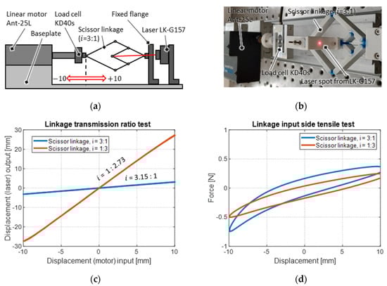 Illustration of the setup for the characterization of the scissor linkage mechanisms: (a) schematic, (b) photo, (c) measurement results for the stroke transmission factor, (d) results for the reaction force measured on the input side.