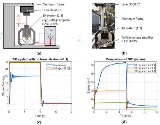 Each of the three realized systems is characterized in terms of the stroke achieved upon electrical excitation. The experimental setup used for this purpose is illustrated schematically in Figure 13a and shown as a photo in Figure 13b. The setup includes a C-shaped aluminum frame, where the SIP actuator system is fixed on the bottom baseplate, and the laser type LK-G157 of by Keyence Corporation (Osaka, Japan) is mounted above. The laser beam aims at the surface of the guided cylindrical rod, where the stroke output of the SIP system is measured. The SIP is electrically connected to a high-voltage amplifier HA51U-3P5 by hivolt.de GmbH & Co. KG (Hamburg, Germany). Control and data acquisition are implemented in a real-time high-resolution National Instruments LabVIEW FPGA environment. Each of the systems is supplied with a voltage step of amplitude 2.9 kV. As explained in Section 4.2., the system is designed to be bistable and no proportional positioning can be achieved. Applying a steep voltage excitation helps overcome static friction effects by exploiting the system’s dynamic response. The resulting voltage excitation and corresponding stroke response of the SIP actuator system with no transmission mechanism ( = 1:1) are given in Figure 13c. The response of the system stroke to the voltage excitation is highly dynamic. It initially presents a set of underdamped free oscillations, then settles with a transient behavior to a maximum value of 20 mm within 0.5 s, and then remains constant. Also, if the voltage is switched off, the system reacts very quickly and exhibits an underdamped dynamic behavior before settling back to the initial position.