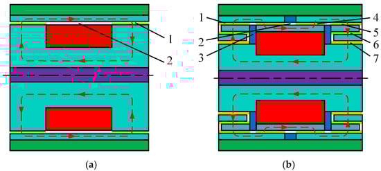 Structural schematic of the MR damper: (a) Traditional MR damper; (b) Proposed MR damper. 1. Magnetic activated region, 2. Non-flux region, 3. Non-magnetic material, 4. Second outer gap, 5. First outer gap, 6. Middle gap, 7. Inner gap.
