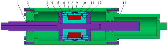 Schematic diagram of the MR damper with folded resistance gaps and bending magnetic circuit. 1. Piston rod, 2. End cover, 3. Cylinder, 4. Piston cover, 5. Inner magnetic sleeve, 6. Middle magnetic sleeve, 7. Outer magnetic sleeve. 8, Exciting coil, 9. Non-magnetic ring, 10. Magnetic semicircle, 11. Non-magnetic disk, 12. Magnetic core, 13. End shield.