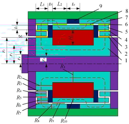 Simplified magnetic circuit of the proposed MR damper. 1. Magnetic core, 2. Inner gap, 3. Inner magnetic sleeve, 4. Middle gap, 5. Middle magnetic sleeve, 6. First outer gap, 7. Outer magnetic sleeve, 8. Second outer gap, 9. Non-magnetic ring.