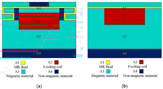 Axisymmetric model for the FEA: (a) Proposed MR damper; (b) Traditional MR damper.