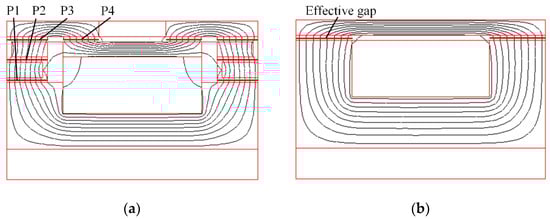 Figure 6 shows the magnetic flux of the designed MR damper and the traditional MR damper with the current of 1.5 A, respectively. In the proposed MR damper, there are inner effective gaps (P1), middle effective gaps (P2) and outer effective gaps (P3) and (P4), which increase the total length of the effective gaps, as shown in Figure 6a. Notably, when the bending magnetic circuit passed through the second outer gaps (P4), there are two sections to be activated effectively, which also contribute to the growth of the total length of the effective gaps. In contrast, there are only two short effective gaps in the traditional damper, as shown in Figure 6b.