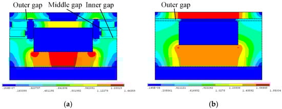 Figure 7 shows the contours of magnetic flux density of the both MR damper at the current of 1.5 A. More than half of the flow path of the traditional MR damper is absent in the magnetic field. However, the inner, middle gaps and majority of outer gaps in Figure 7a are all exposed to the magnetic field. The magnetic flux density of the inner gaps is approximately 0.5 T. The maximum magnetic flux density of the proposed MR damper, which is at the magnetic core, is 1.4 T, while the larger value of 1.8 T is observed in the traditional one, which is close to the magnetic saturation of the magnetic material. The latter has lower magnetic resistance, leading to premature magnetic saturation that can be relatively avoided in the former, that is, the proposed MR damper could achieve a high utilization rate of the magnetic field.