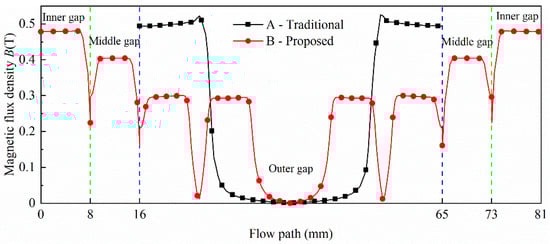 Figure 8 shows the distribution of magnetic flux density value as a function of the annular gap paths of the two MR dampers. The gap path of traditional MR damper is divided into three sections. The magnetic flux density of the two ends of the gap path is nearly 0.5 T. There is no magnetic flux line passing through the middle section in the gap path, where the flux density is close to 0 T. Even though the magnetic flux density in the middle and outer gap of the proposed MR damper is lower to the traditional one, the length of the effective gap in the proposed one visibly extended, owing to the addition of extra inner, middle gaps and the activation of the second outer gaps.