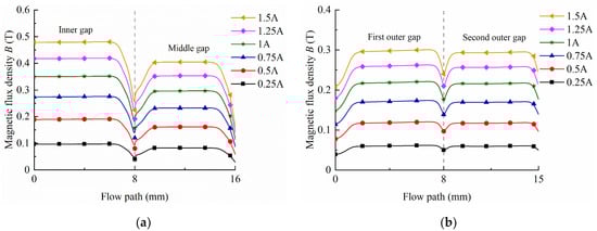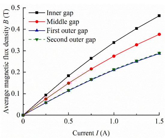 Figure 10 shows the average magnetic flux density obtained by integrating the magnetic flux density of the gap. In the first place, the average magnetic flux density of the folded resistance gaps increases from the outside to the inside because of the decrease in the magnetic flux area under a specific current. That is why the average magnetic flux density of the first outer gap and the second outer gap is approximately the same, as they share identical radii. In addition, as the applied current increases, the average magnetic flux density of each gap increases. Under the applied current of 0.25 A to 1.5 A, the value of the inner gap is about from 0.09 T to 0.46 T, and the middle gap from 0.08 T to 0.38 T, and the outer gaps from 0.06 T to 0.29 T, respectively.