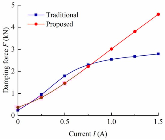 The damping forces for both MR dampers are evaluated by combining the mathematical models and FEA results, as shown Figure 11. Since the total flow gap length of the proposed MR damper is longer than that of the traditional one, the damping force of the former is slightly greater than that of the latter at the current of 0. Meanwhile, though the damping force of the latter is slightly higher than that of the former in the small current range (from 0.25 A to 0.75 A), the output damping force of the proposed one is much greater than the traditional one when the current is larger than 0.75 A. When the current is 1.5 A, the output damping force of the proposed MR damper reaches 4585 N, which is about 1.64 times that of the traditional. Generally speaking, the damping force of the proposed MR damper is approximately linear to the current within the range of 0–1.5 A, while the damping force curve of traditional damper is nonlinear. These indicate that the output damping range of the proposed MR damper is much larger than that of the traditional one.