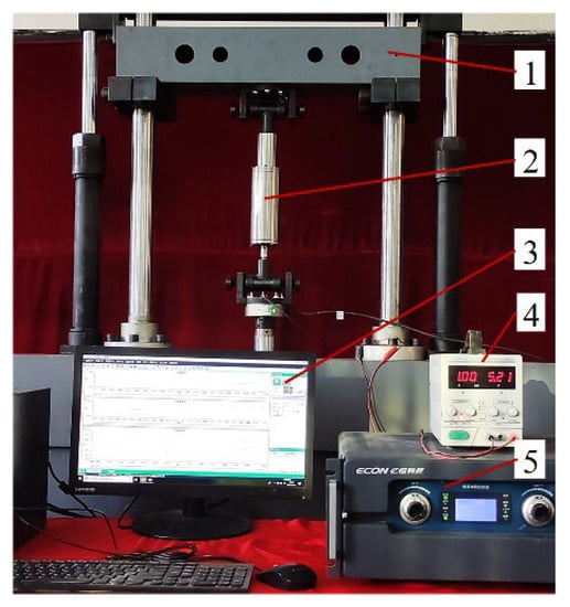 Experimental test rig of MR damper: 1. Vibration excitation platform, 2. proposed MR damper, 3. controlled computer, 4. DC power supply, 5. electro-hydraulic servo controller.