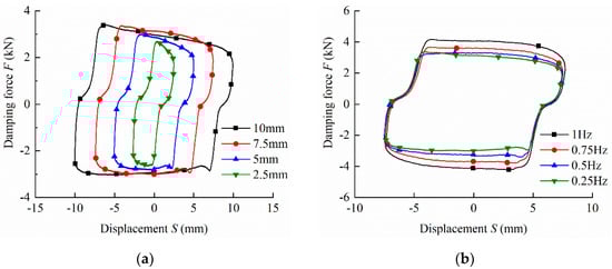 Figure 14a shows the damping force of different amplitudes with the frequency of 0.25 Hz and the current of 1 A; the maximum damping force increases with amplitudes. Figure 14b shows the damping force of different frequencies with the amplitude of 7.5 mm and the current of 1 A; the maximum damping force increases with frequencies. The piston vibration velocity of piston is proportional to the volumetric flow rate. For the positive correlation applies equally to the relation between the volumetric flow rate and viscous damping force, which is explained in Equation (10). Considering the viscous damping force accounts for a small proportion of the total damping force under the low speed excitation, the damping force increases slightly with the amplitude and frequency, as is shown in Figure 14.