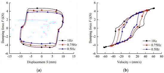Figure 15 shows the damping force at three frequency levels of 0.5 Hz, 0.75 Hz and 1 Hz with the current of 1 A and the amplitude of 10 mm. Figure 15a verifies the statement in Figure 13 that the variation in damping force and frequency is consistent. When the frequency is 1 Hz, the maximum damping force of the damper is 4739 N. Figure 15b illustrates the relationship between damping force and velocity. The variation curve of maximum damping forces at different frequencies but at the same velocity almost overlaps, namely if the speed and the current are fixed, the output damping forces are roughly the same. The results indicate that the MR damper has a stable damping force and controllability under different exciting conditions.