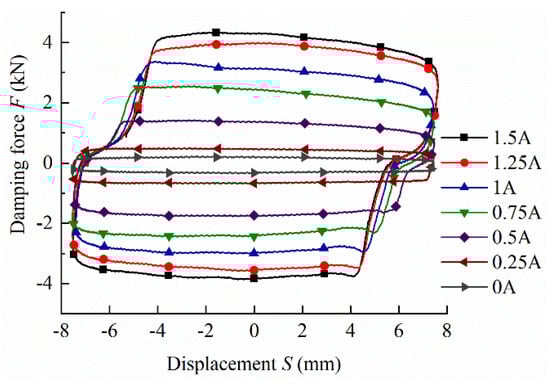 Figure 16 shows the tested output damping force values at a frequency of 0.25 Hz and an amplitude of 7.5 mm for five current levels, namely 0 A, 0.5 A, 0.75 A, 1 A, and 1.5 A. The output damping force increases with the increasing current. When the input current is set to be 0 A and 1.5 A, the corresponding output damping force are 225 N and 4346 N, respectively. The damping force of the proposed MR damper is 1.56 times that of the traditional at the current of 1.5 A. This indicates that the MR damper is able to utilize the magnetic field generated by the excitation coil more effectively, and can provide higher controllable damping force.