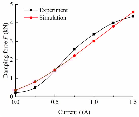 As shown in Figure 17, the simulation and experimental results under different currents were compared to verify the feasibility of the established damping force model. The variation curve of the simulated damping force with current is approximately linear while the linear relationship is not obvious in the experiments. The difference between the model and the experiment was caused by the errors of manufacturing and experiment, and the established model cannot represent the small change in pressure drop. The maximum error is 366 N when the current is 1 A. However, the errors are within the allowable range, and the growth trend of the damping force predicted by the established model is almost the same as measured in the experiments. The damping force of the experimental model and the established model increases with the current. The predicted model established by the Bingham model is simple and easy to implement, so it is suitable for designing the MR damper proposed in this study.