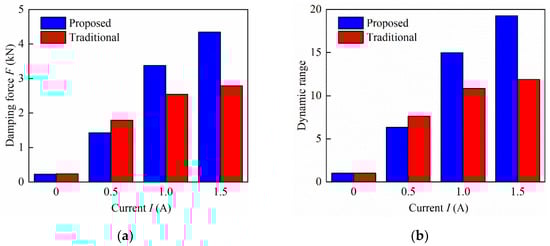 Comparison of the damping performance between the proposed and the traditional MR damper: (a) Damping force versus current; (b) Dynamic range versus current.
