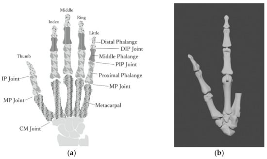 Hand anatomy: (a) joint and phalanges of the hand; (b) adjusted 3D bone model (thumb and index) using Japanese standard female data.