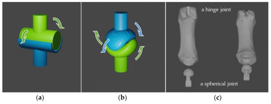 Finger joints schematic diagram: (a) hinge joint; (b) saddle joint; (c) metacarpal of thumb model with a ball and socket joint part (left: front view, right: oblique downward view).