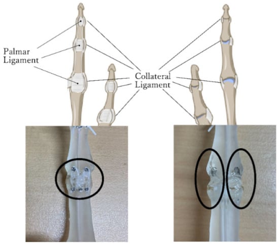 Index fingers have two types of ligaments, the palmar and collateral ligaments, as shown in Figure 3. Collateral ligaments control the excessive lateral movements of the joints and maintain the stability of joint parts. In this study, collateral ligaments were simulated by using an adhesive. Figure 3 shows the collateral ligament portion of the phalanx model used in the experiment. Two types of viscoelasticity adhesives were used: E6000 sold by Eclectic Products, Inc. and cemedine BBX sold by CEMEDINE CO. Comparing these two adhesives, E6000 has higher adhesive strength and is slightly sticky after drying, while cemedine BBX has a slightly softer adhesive part after drying and is more stable in the joint area. Therefore, the use of E6000 on top of cemedine BBX reproduced the collateral ligaments, which allow soft movements while maintaining joint stability.