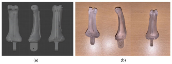 The aforementioned muscles enable the hand to perform a variety of movements. When developing a prosthetic hand, it is necessary to reproduce various movements with a minimum number of motors, taking weight and cost into consideration. In this study, we designed a tendon sheath for eight tendons, four each for the index finger and thumb, on the phalange model. The actual trajectories are shown in Figure 5a. The completed actual phalange model is shown in Figure 5b.