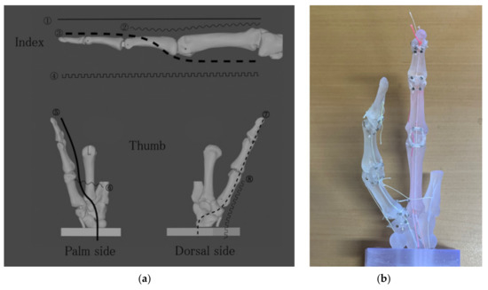 Trajectory of tendon sheath designed on the phalange model: (a) For the index, (1), (2) extensor digitorum, (3) flexor digitorum profundus, and (4) interosseous and lumbricals are designed. For the thumb, (5) flexor pollicis longus, (6) adductor pollicis, (7) extensor pollicis longus, and (8) abductor pollicis longus; (b) Prototype of the biomimetic fingers.
