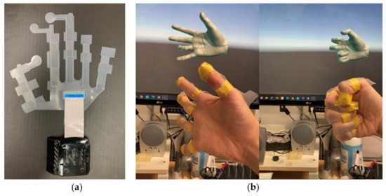 Two important proprioceptors that play a role in flexibility are the muscle spindle and the Golgi tendon organ. Figure 7a shows the viscoelastic angle sensor (custom-made, Feel the Same LLC., Ulsan, Korea) with silicon and liquid metal. The sensor measures the angle of a finger based on the resistance value of the liquid metal, which changes as the metal strain gages. The output voltage returns the amount of change in resistance between 0 to 1, which applies to the angle range set by the user. The angle range except DIP joint was set from 0° to 100°, and from 0° to 80° only for the DIP joint. The sensitivity of the sensor was set to 0.01. For the index finger, sensors are attached only to the PIP and MCP joints, and the DIP joint values are calculated from the PIP joint values. Each sensor measures the angles of the DIP and PIP joints of the thumb but cannot measure the angle of the CMC joint. The sensors are wireless and run using Unity. The program that scans the sensor values is in the update method; thus, the angle is measured every frame. Therefore, the number of scans per second depends on the specifications of the PC. In the environment of this study, about 100 scans were performed per second. Figure 7b shows the hand in the open and grasped states. When the sensor is attached to the prosthetic hand, it is useful to measure the hand gestures.
