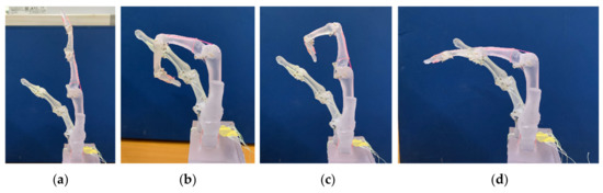 We also reproduced thumb movements, as shown in Figure 10. The thumb has a complex movement, but as mentioned above, the proposed hand has four muscles: extensor, flexor, abductor, and adductor muscles. It showed the difference between abduction (Figure 10a) and adduction (Figure 10c). Complex motions of the thumb could be reproduced, such as IP/MP flexion with CM abduction (Figure 10b) and IP/MP flexion with CM adduction (Figure 10d). We, however, could not record these complex motions of the thumb from the attached sensor alone, except for flexion and extension (Figure S1). As for the thumb, the sensor needs to be redesigned to measure these compound motions.