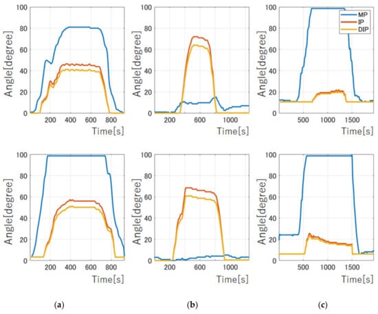 Angle of each joint from liquid metal sensor. Upper panel from human movements. Bottom panel from finger robot. Blue lines show MP joint movements. Red lines represent those of IP joint. Orange lines stand for those of DIP joint. (a) Flexion and extension operation; (b) IP/DIP joint operation; (c) MP joint only operation.